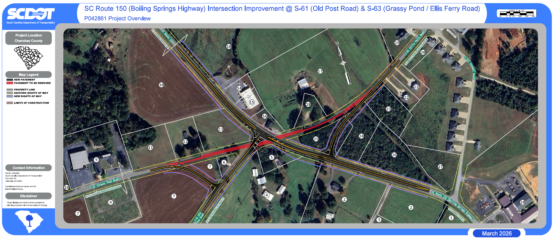 The South Carolina Department of Transportation (SCDOT) in partnership with the Appalachian Council of Governments (ACOG) proposes to improve the intersection of SC 150 (Boiling Springs Highway) at Grassy Pond Road, Old Post Road, and Ellis Ferry Road.