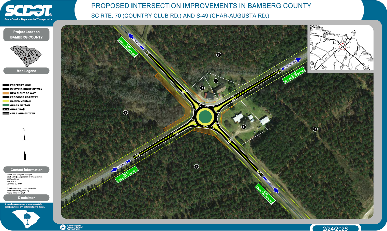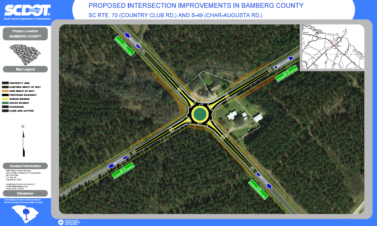 The South Carolina Department of Transportation (SCDOT) proposes to improve the intersection of SC 70 (Country Club Rd.) at S-49 (Char-Augusta Rd.) in Bamberg County.