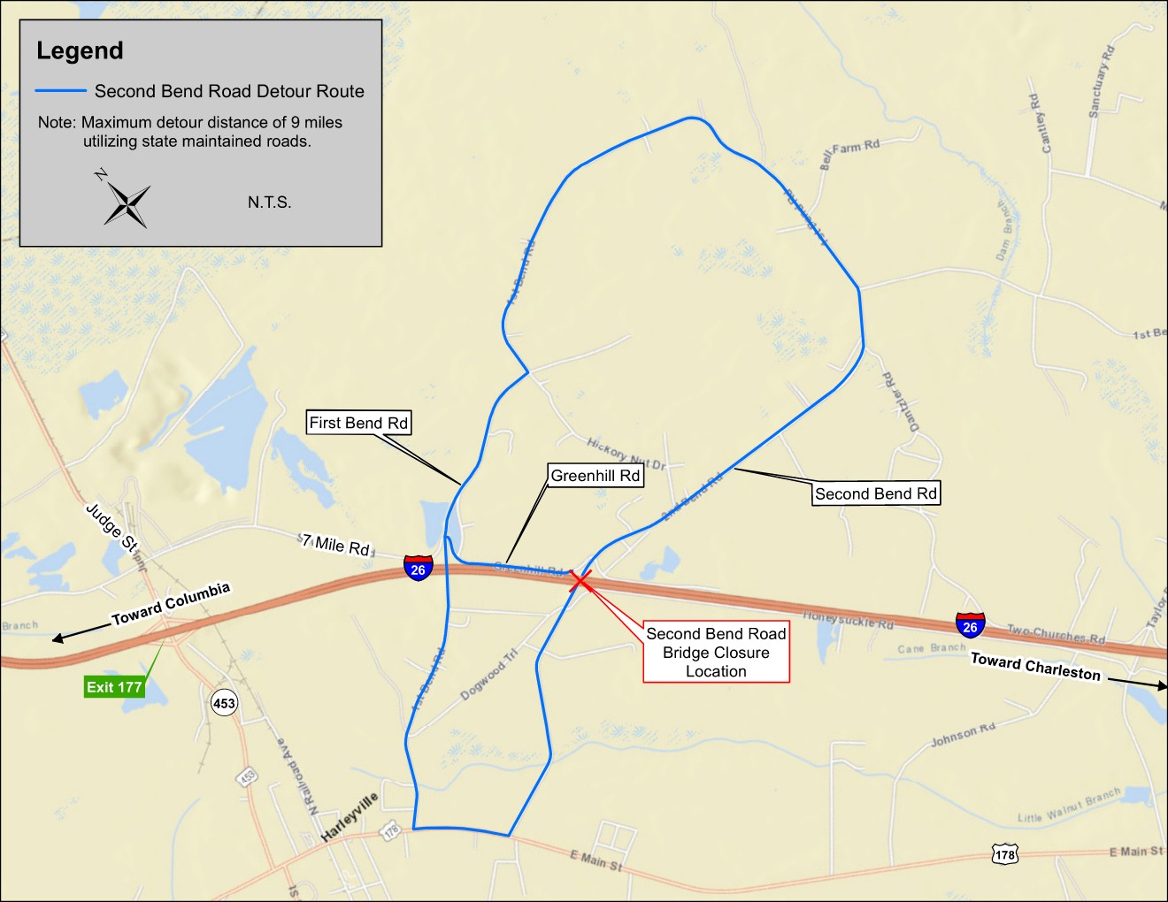 - Access across I-26 from Second Bend Road will be detoured for approximately 12 months while demolition and new construction is completed.