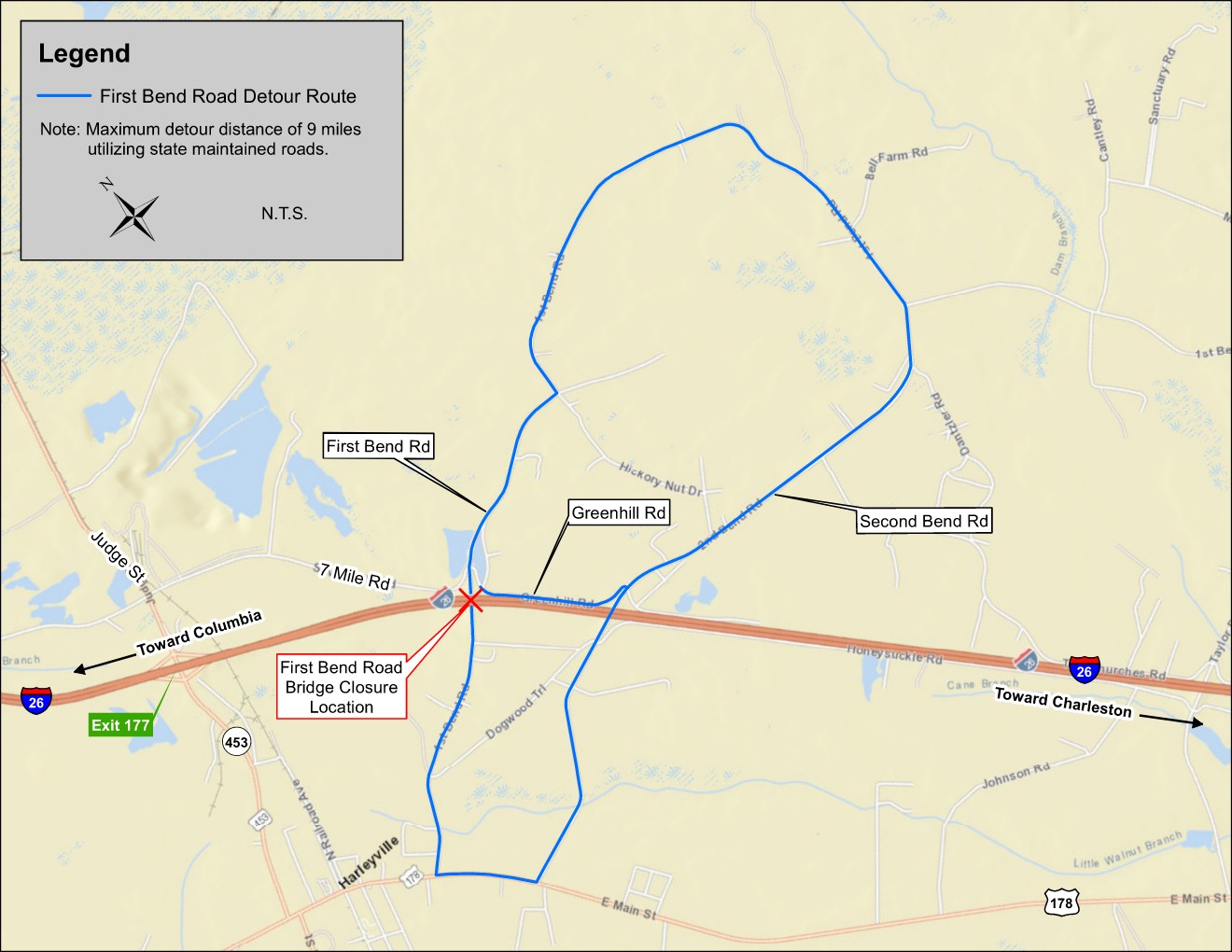 - Access across I-26 from First Bend Road will be detoured for approximately 12 months while demolition and new construction is completed.