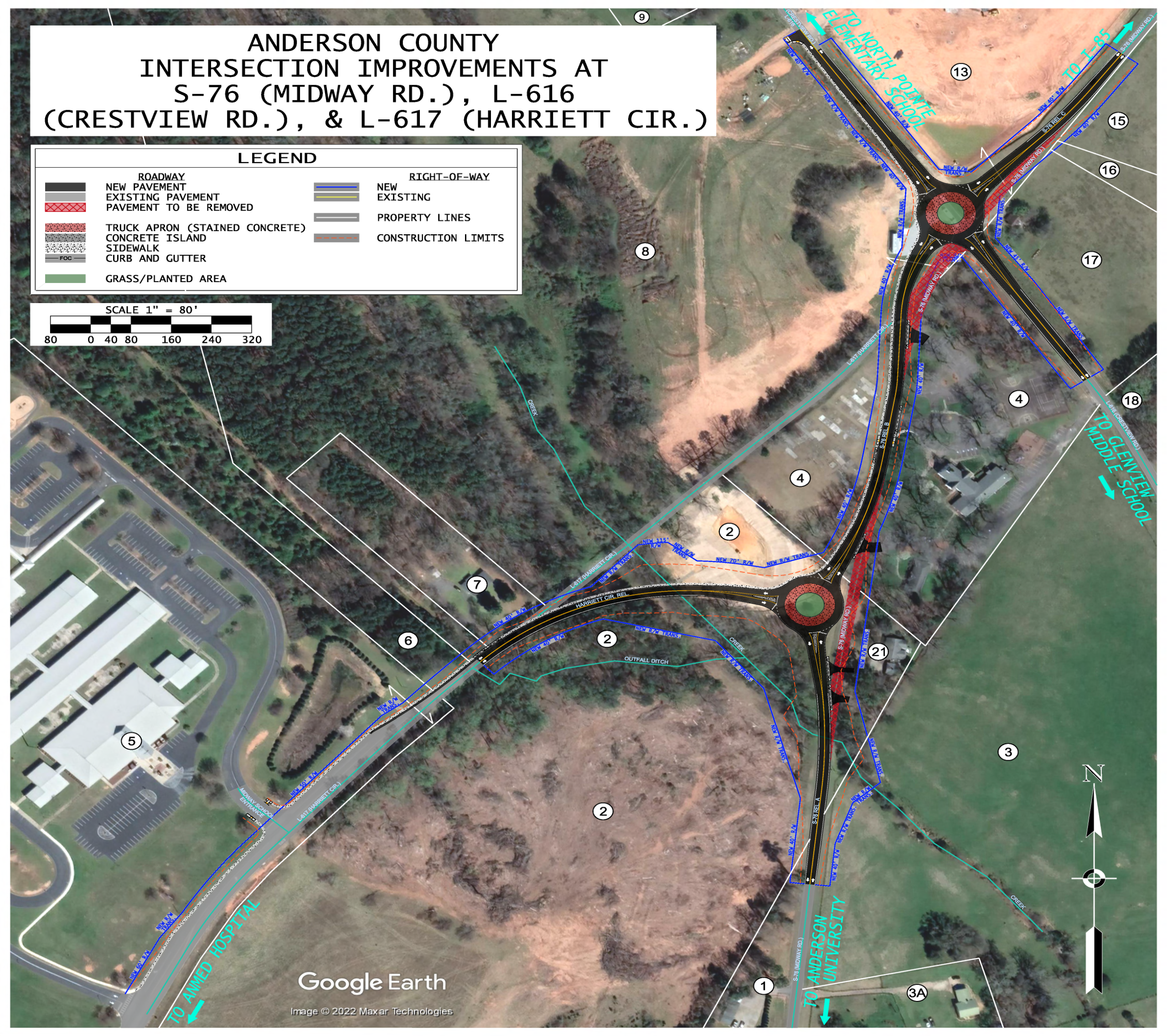 The proposed improvements include the construction of two single-lane roundabouts: one at the intersection of Crestview Road and Midway Road, and a second at the intersection of Harriett Circle and Midway Road.