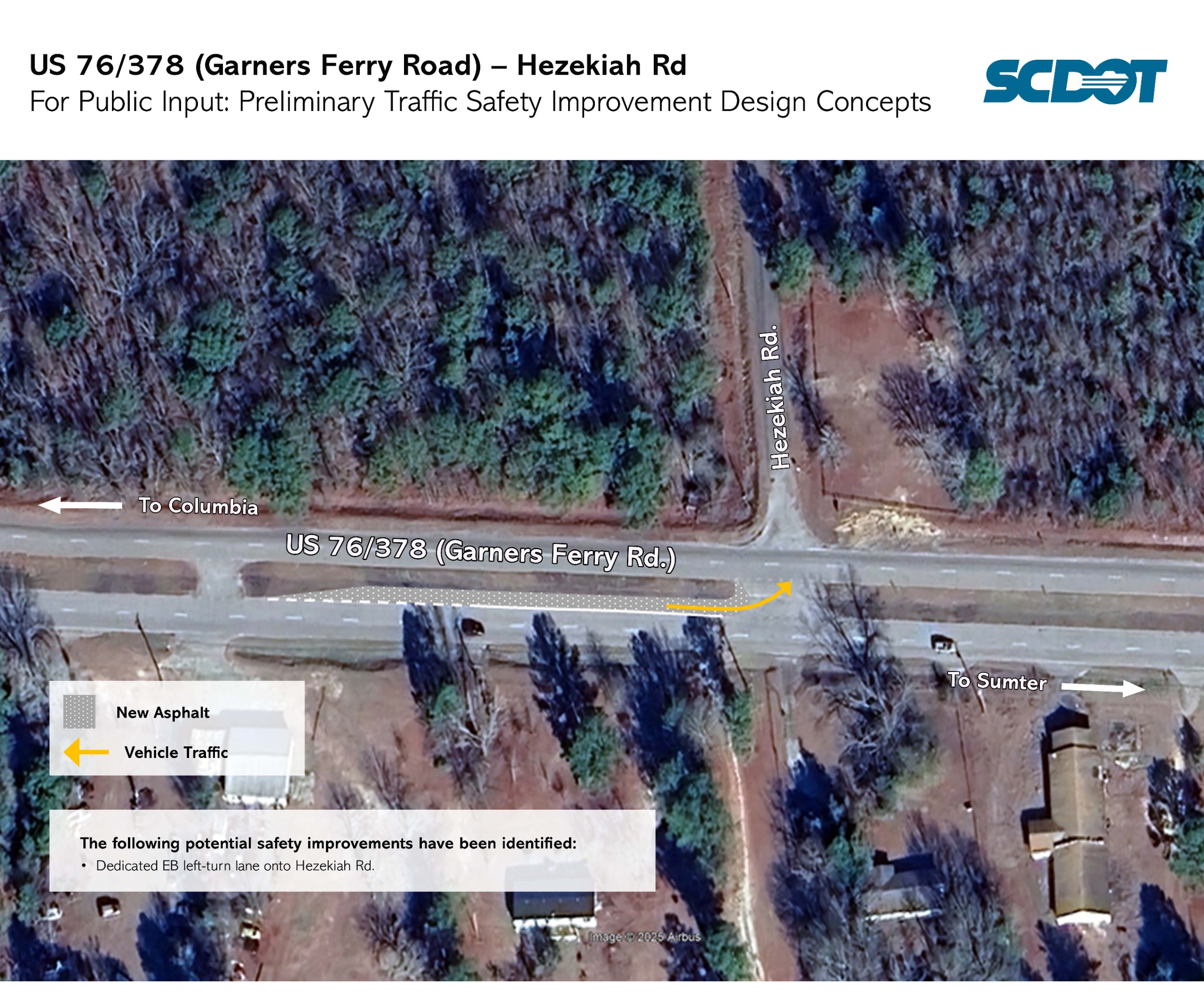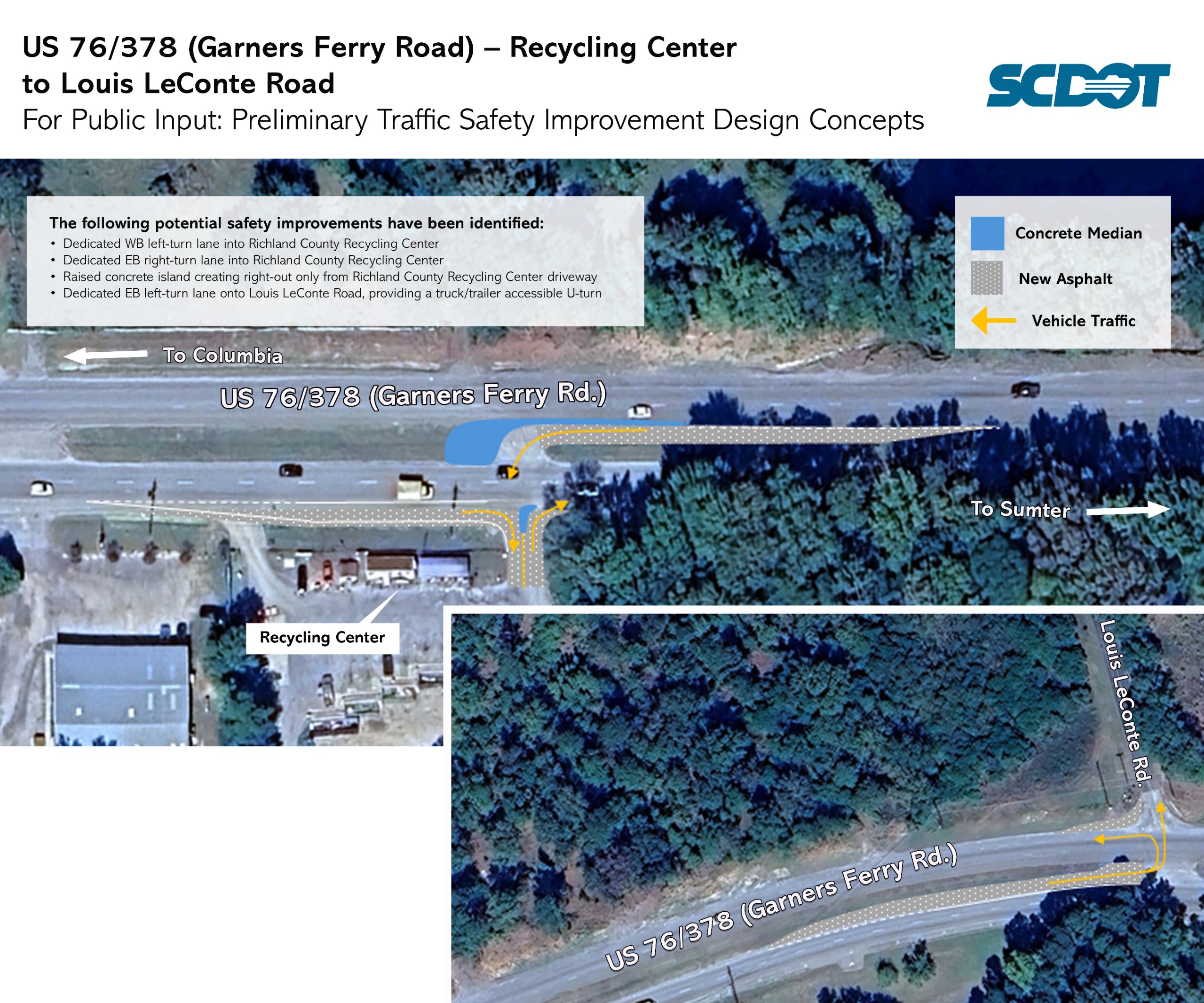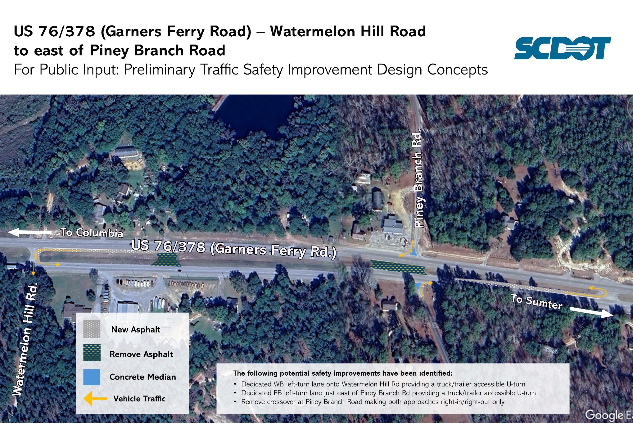 The South Carolina Department of Tranportation (SCDOT) proposes to improve traffic safety along a high-crash section of US 76/378 (Garners Ferry Road) in Richland County, between Horrell Hill Road and the Sumter County line.